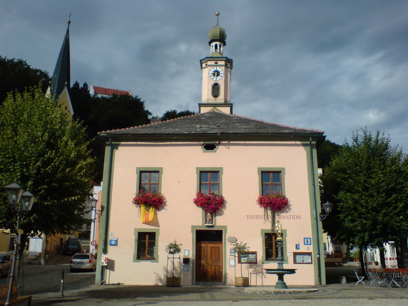 Die Tourist-Information finden Sie, indem Sie durch das Tor und geradeaus bis zum zentralen Marktplatz („Ludwigsplatz“) fahren. Links einbiegend kommen Sie zum gleich linker Hand gelegenen „i“.