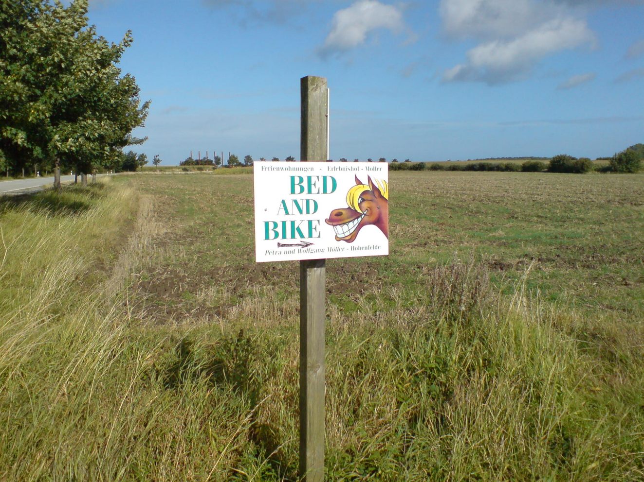 Kurz vor dem Ort biegen Sie links auf den Geh- und Radweg der Landesstraße L 165 ein und folgen dieser bis zum Abzweig links nach Hohenfelde-Mohnkamp. In der Häuseransammlung zweigt die Etappe alsbald rechts auf einen Feldweg ab, der von weniger guter Beschaffenheit ist nach Regen oft pfützenreich, bei längerer Trockenheit teils recht sandig. Es sind aber nur ca. 1½ km bis Satjendorf, wo wieder fester Rollbelag geboten wird, kurz allerdings auch grobes Pflaster. Wenige Meter weiter queren Sie die L 259 geradeaus, und genau dort stand zurzeit der Recherchen ein netter Hinweis auf eine Übernachtungsmöglichkeit: Na, schon müde?